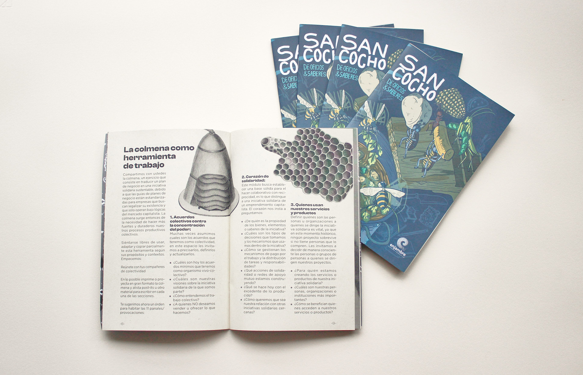 Recoge el proceso desarrollado en el marco de la implementación de la Beca para impulsar la asociatividad y el trabajo en red de las economías propias, populares y alternativas, por Enjambre juntanza cooperativa, con el apoyo del Ministerio de las Culturas las Artes y los Saberes durante el 2024. Este texto recoge las memorias del proceso, así como las reflexiones escritas producidas por las 16 iniciativas que dieron vida al Sancocho de Oficios y saberes, llevado a cabo en Bogotá. El fanzine se compone de dos partes, la primera constituída por los deseos e inquietudes anticapitalistas. La segunda sección presenta la colmena, herramienta de trabajo diseñada para compartir con otras organizaciones y colectividades una serie de pasos a seguir para fortalecer sus procesos autogestivos.